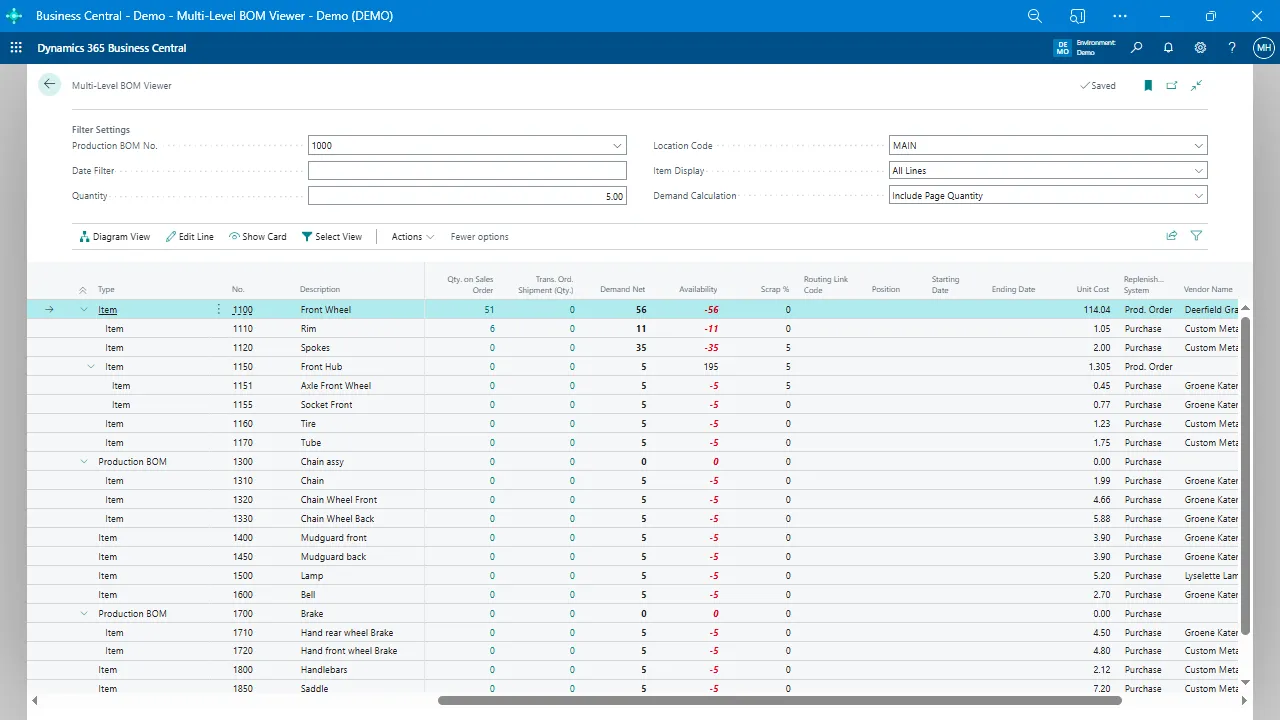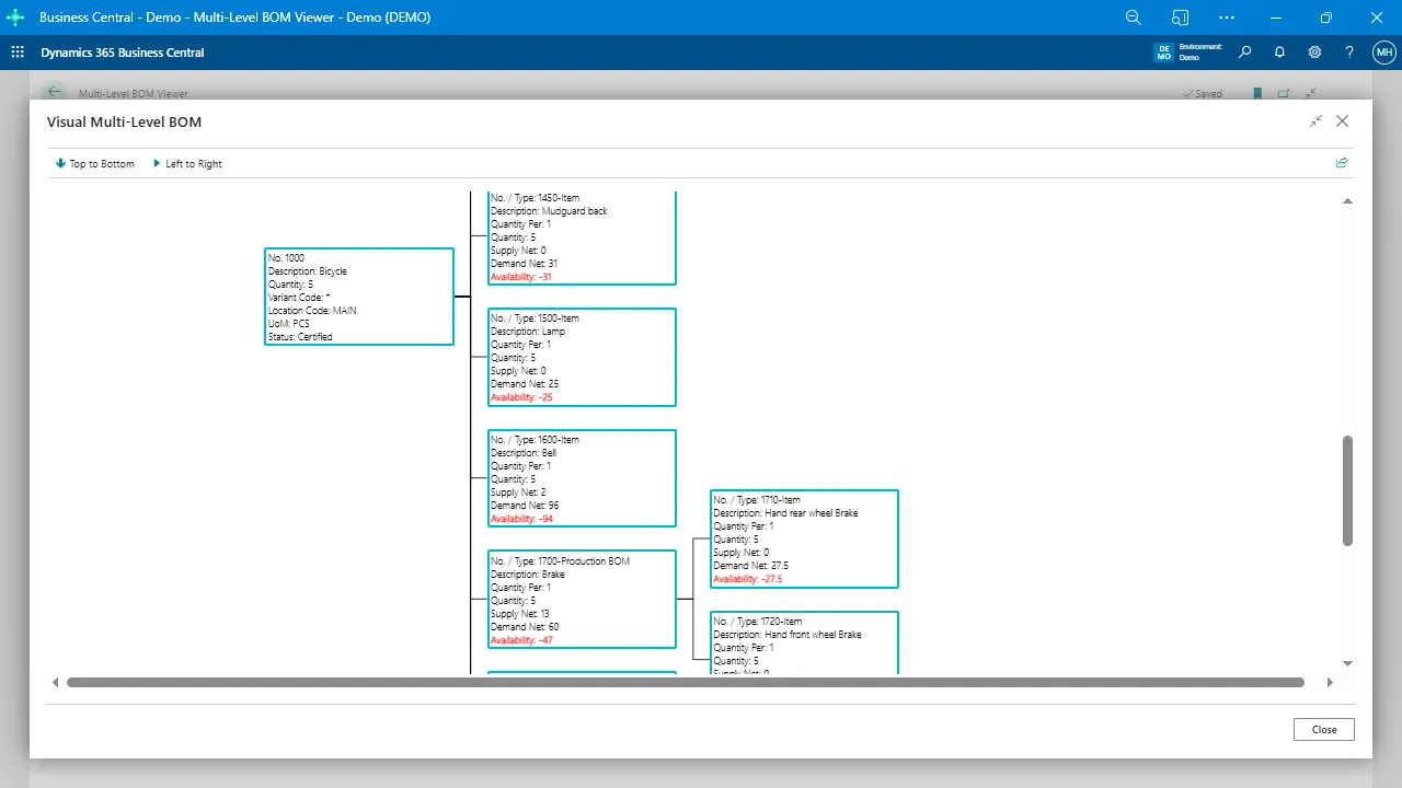 Instead of flipping between item cards and structure views, the Multi-Level BOM Viewer presents your entire production BOM in one screen—complete with demand, availability, and supply planning details.
