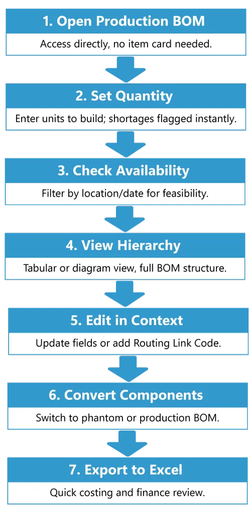 - Convert Components on the Fly: Need a component to act as a phantom or its own production BOM? Switch it instantly without the recertification headaches—Business Central supports it, and the viewer makes it quick and easy.
