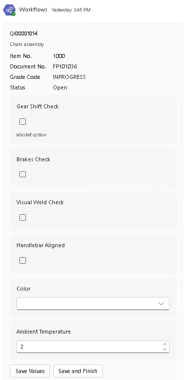 - Reduced Manual Data Entry: Adaptive Cards send inspection values directly back to Quality Inspector in Microsoft Dynamics 365 Business Central. The integration removes duplicate entries and transcription. Quality teams benefit from fewer data errors and stronger audit reliability.