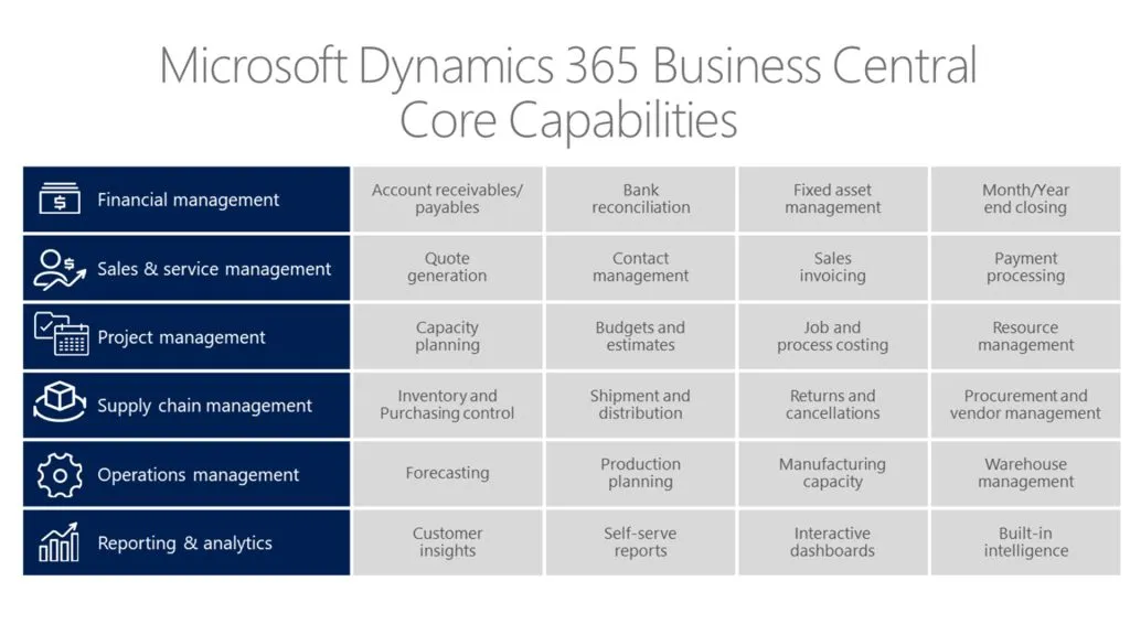 Microsoft Dynamics 365 Business Central is a robust, cloud-based Enterprise Resource Planning (ERP) solution designed to help businesses manage their operations efficiently. It comprises various modules, each tailored to streamline different aspects of business management. The core modules include Finance Management, Sales & Service Management, Project Management, Supply Chain Management, and Operations Management.